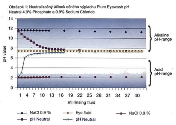 Z grafu účinkov neutralizácie zreteľne vyplýva, že neutralizácia očného prostredia fosfátovým pufrovým roztokom je vysoko účinná a hodnota pH 7,4 je dosiahnutá už po cca 3 minútach, na rozdiel od riedenia očného prostredia len chloridom sodným alebo čistou vodou, kde je optimálna hodnota dosiahnutá až po viac ako 12-tich minútach, čo môže byť neskoro.