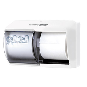 Dávkovač na 2 rolky klasického toaletného papiera . Posuvný priehľadný kryt chráni nepoužívanú rolku . Vybavený zámkou. Montáž na stenu.