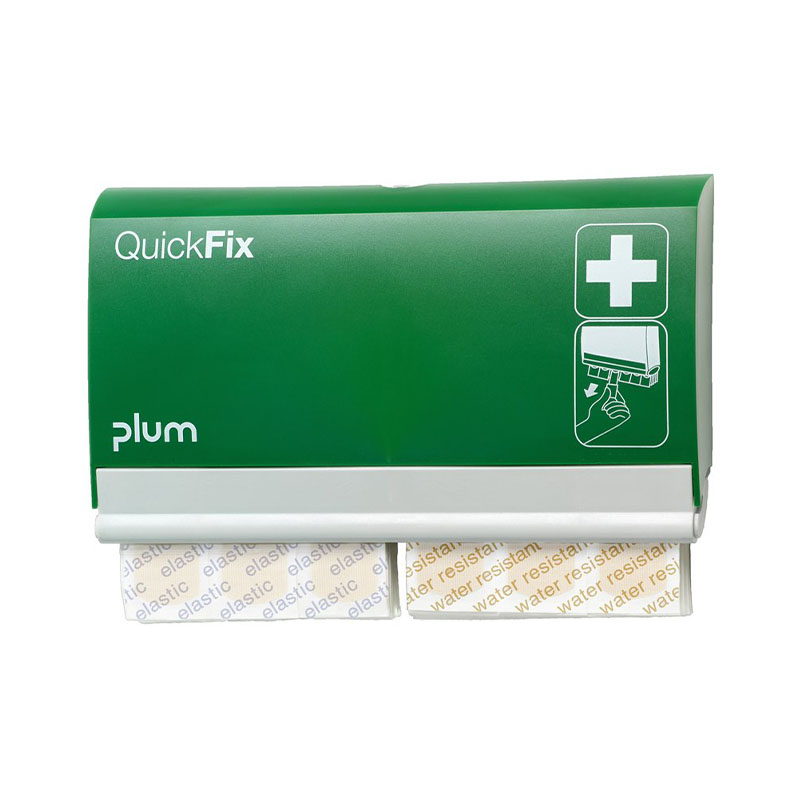 Nástenný dávkovač QuickFix vrátane 1 x 45 ks náhradného balenia vodovzdorných náplastí a 1 x 45 ks elastických náplastí.