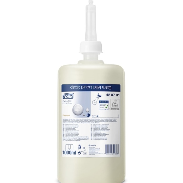 Doprajte citlivej pokožke extra starostlivosť s Tork extra jemným tekutým mydlom. Vďaka jemným prísadám a receptúre bez vôní a farbív je toto mydlo veľmi šetrné k pokožke. Certifikované Nadáciou Európskeho centra pre výskum alergií (ECARF) ako vhodné pre alergikov. Vhodné pre Tork zásobník na tekuté mydlo a mydlo v spreji, ktorý sa ľahko používa a poskytuje správnu hygienu rúk všetkým, ktorí ho použijú