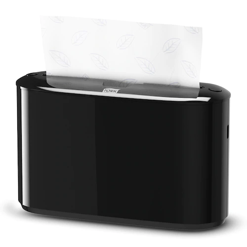 Tork čierny plast dizajnový dávkovač na skladané utierky Multifold . Prenosný, nevyžaduje montáž na stenu. Moderný a atraktívny dizajn.